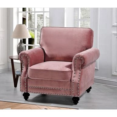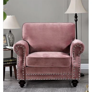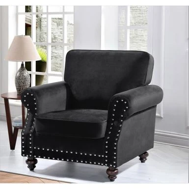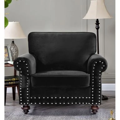 Introducing the Suffield Velvet Nailhead Armchair, a stunning addition to any living space. This armchair is crafted with high-quality materials and features soft velvet upholstery that exudes timeless elegance. The high-density foam provides luxurious comfort while the loose back cushions add visual interest. The solid wood turned legs lend a traditional touch, while nailhead trim along the bottom and arms adds a touch of flair.