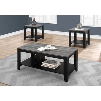 - Characterizing contemporary styling accurately with a grey and black finish, this living room table set includes one coffee table and two end tables