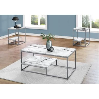 Bring a fresh modern update to your living space with this unique 3 piece coffee table set. The simple contemporary design in a chic white marble-look finish and accented with a silver metal trim, provides a spacious table top with a raised bottom half shelf for additional storage and display. The matching end tables are perfect to place a lamp, pictures, or other decorative objects while the coffee table will be an attractive focal point in your living room, den, or family room.