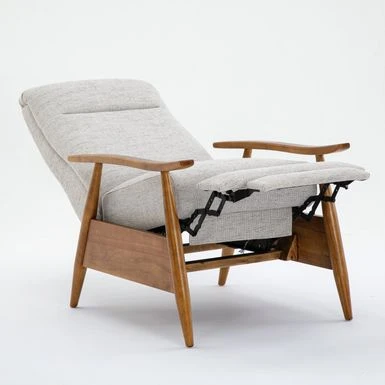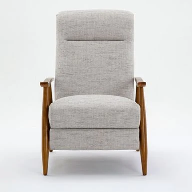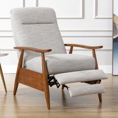 Upgrade your living room with the Taylor wood arm push back recliner by Greyson Living. Its elegant, modern style features an exposed wooden frame and arms finished in Chestnut brown, complemented by a comfortable seat upholstered in durable and easy-to-clean performance fabric. With drop-in coil seating and a cushioned headrest, this recliner offers both comfort and style. Choose from Sea Oat or Ashen Gray performance fabric to suit your decor.