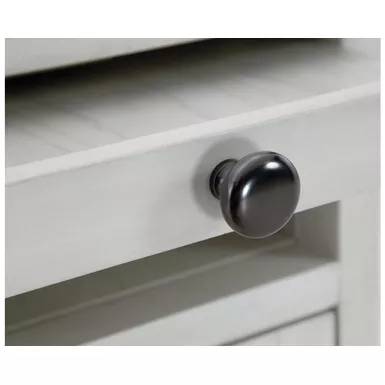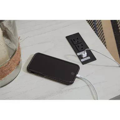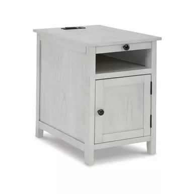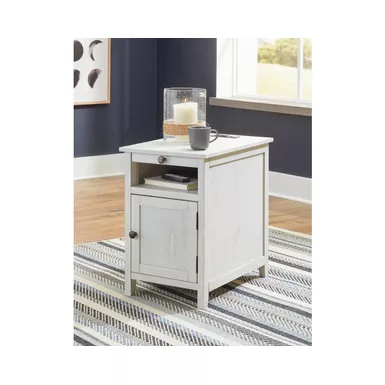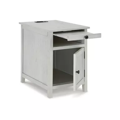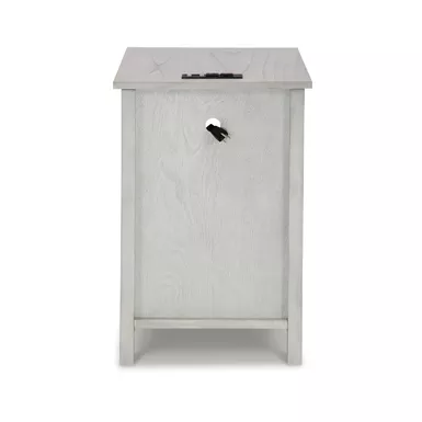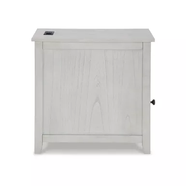 Add big character to a small space with this chairside end table. With its compact size and strong silhouette, it can go anywhere and blend easily into the decor. Less is so much more with the Shaker-inspired design and whitewashed wood grain finish. Loaded with form and function, this end table displays accent pieces and stores essentials securely while keeping devices powered up.
