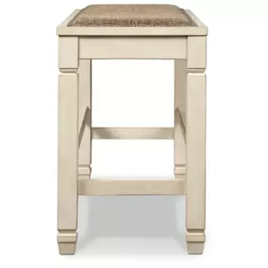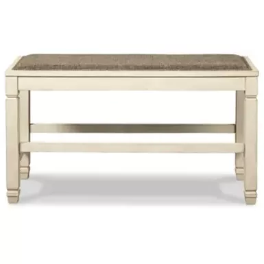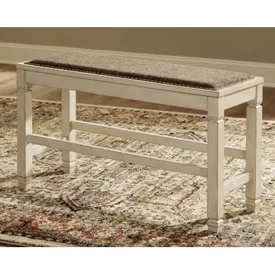 The beauty of the Bolanburg upholstered dining bench is something to savor. Serving up comfort and flair, this generously scaled counter-height bench entices with a cushioned seat covered in a heavy woven fabric that complements the antiqued white finish.