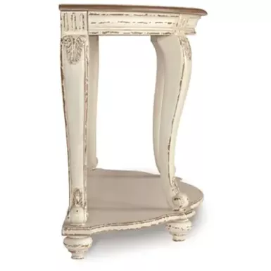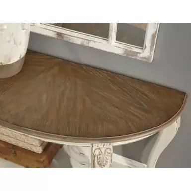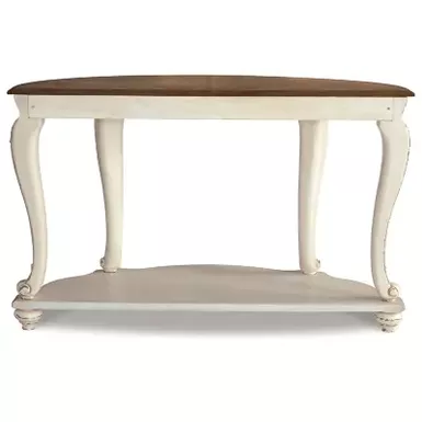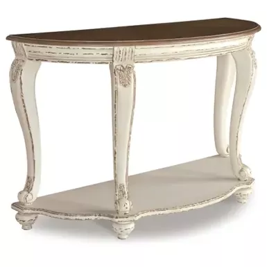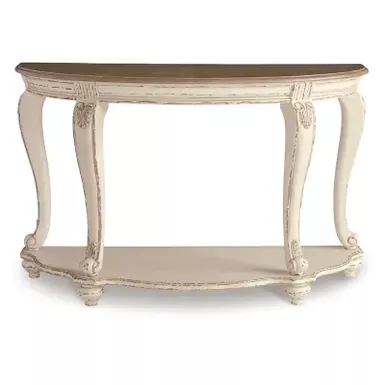 Elevating the art of traditional cottage styling, the Realyn demilune sofa table is sure to serve you beautifully for years to come. Antiqued two-tone aesthetic blends a chipped white with a distressed wood finished top for added charm. Classic cabriole legs and shapely lower shelf are a lovely twist. Decorative corbels add refinement.