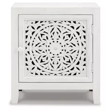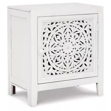 How could you not stare at a masterpiece? The floral carving on the Fossil Ridge accent cabinet is simply magnificent. This beauty is also functional. Pull the door open to reveal storage space with a handy shelf. With its antiqued white finish, this piece is a definite showstopper.