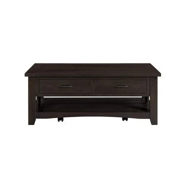 With a dark color shade and functional appeal, the Coffee Table is differently framed with rough-hewn saw marks that make it look rustic. With a dark color shade and functional appeal, the Coffee Table is differently framed with rough-hewn saw marks that make it look rustic. Made from pine wood, the espresso brown finish table features two drawers that can shelter many things along with a spacious open bottom shelf and hidden caster wheels.